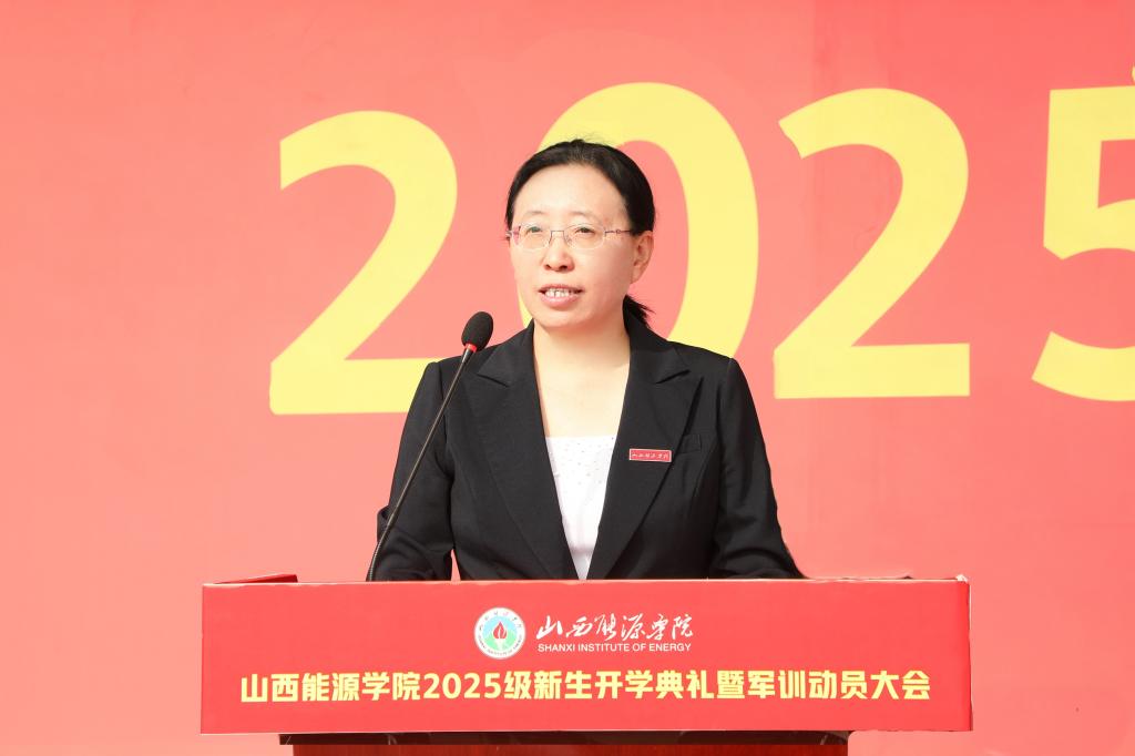 桑楠院长发表题为《以能源报国之姿 赴时代奋进之约》的致辞。她从学校历史沿革、学科建设突破、教学科研成果、优质师资队伍、毕业生就业深造等维度,全面展现学校发展成就,让新生深刻感受到学校的底蕴与实力。桑楠院长指出,当前全球能源结构加速向绿色低碳转型,我国“双碳”目标深入推进,山西作为国家能源革命综合改革示范区,正全力构建“煤矿智能化、电力清洁化、新能源规模化”产业格局。面对时代机遇与行业使命,她对身为“未来能源人”的新生提出三点要求:一是立“能源报国”之志,做有理想的追梦者;二是修“笃学善行”之技,做有本领的实干者;三是养“坚韧务实”之品,做有担当的奋进者。